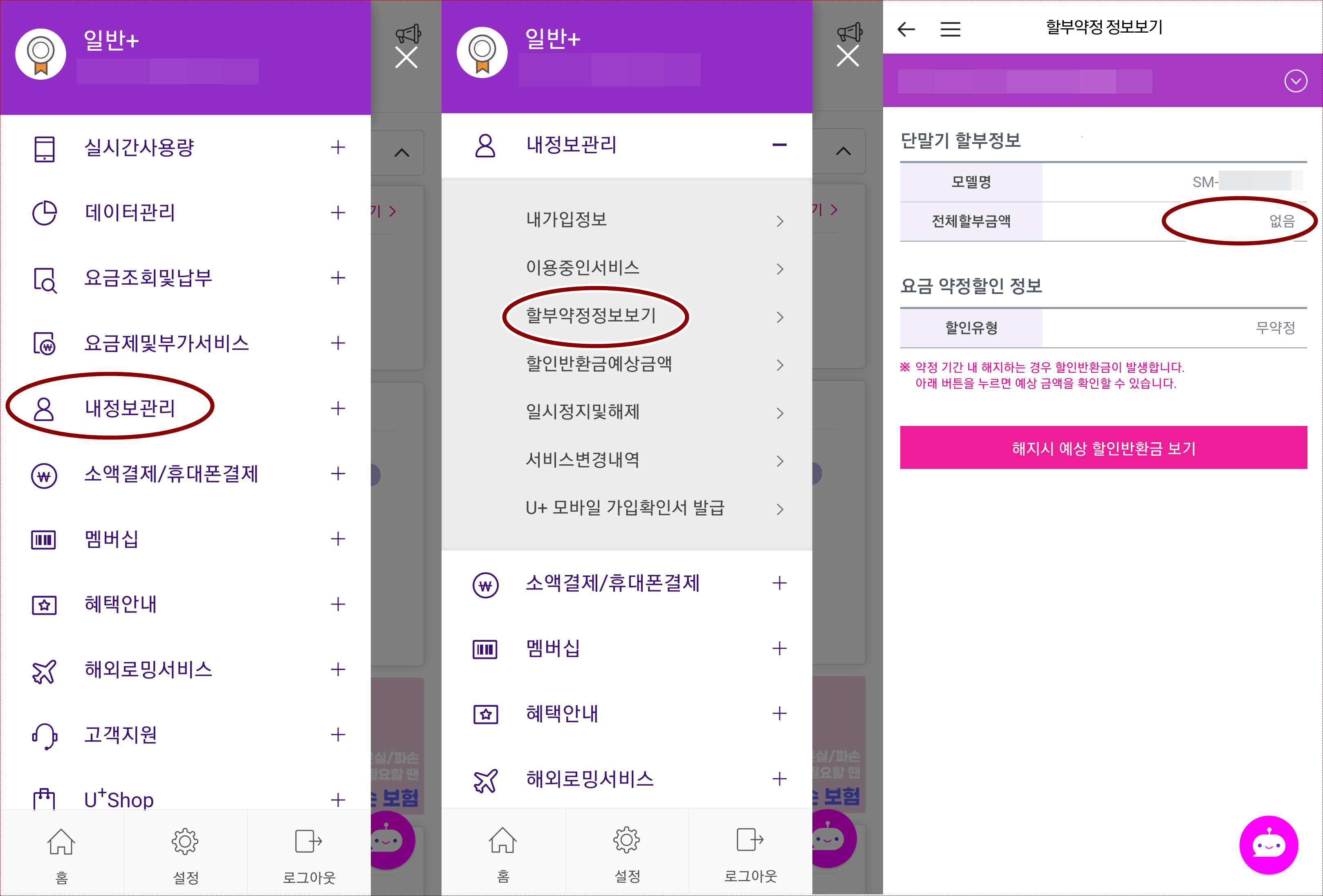 유플러스 고객센터 앱 실행 및 로그인 후 아래 경로