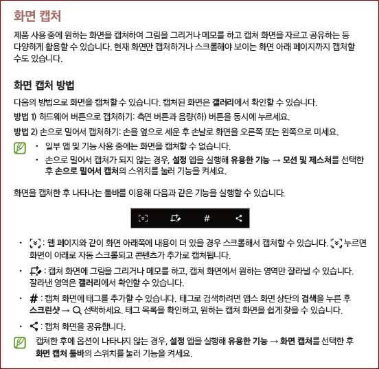 측면 버튼과 음량(하) 버튼을 동시에 짧게 누르시면 캡처됩니다.