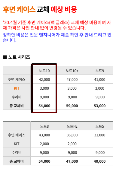 갤럭시노트 10기기의 뒷면(후면) 교체 수리비는