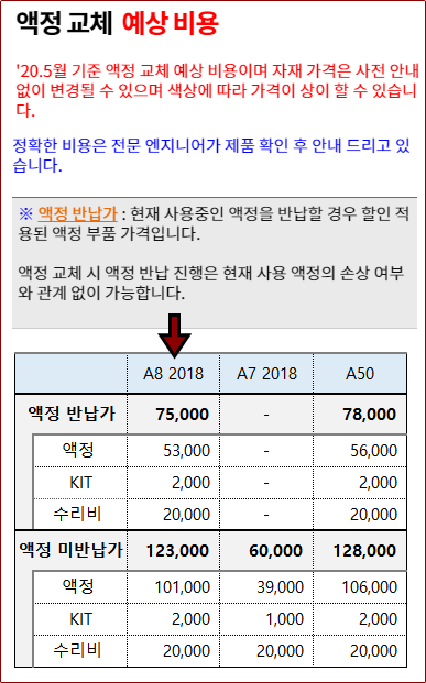 갤럭시A8 2018 기기의 액정 교체 수리비는