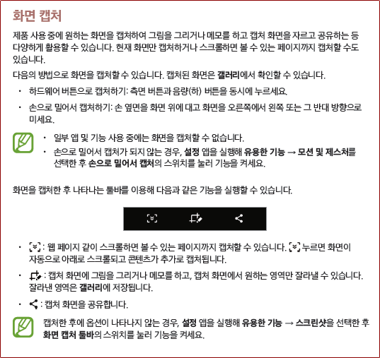 가장 기본적인 방법으로 측면 버튼과 음량(-) 버튼을 동시에 누르시면 캡처(스크린샷) 됩니다.