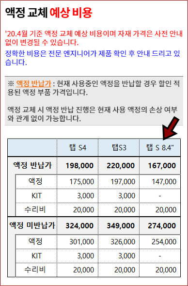 갤럭시탭S 8.4 기기의 액정 교체 수리비는
