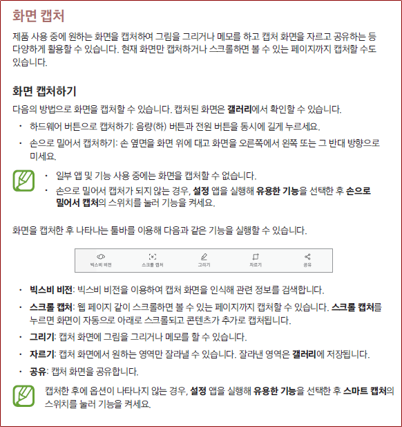 가장 기본적인 방법으로 전원 버튼과 음량(-) 버튼을 동시에 누르시면 캡처(스크린샷) 됩니다.