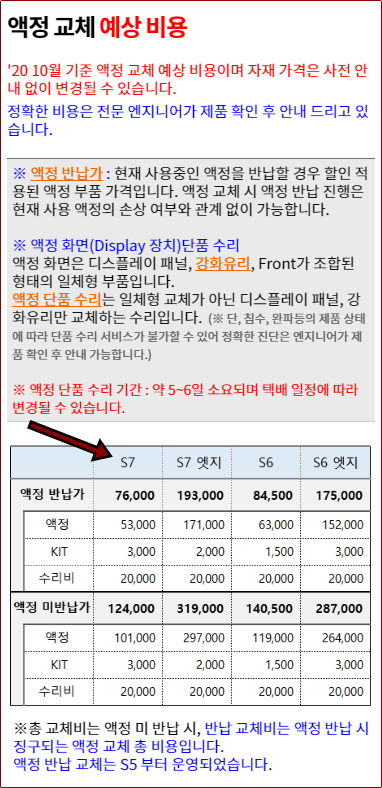 갤럭시S7 기기의 액정 교체 수리비는