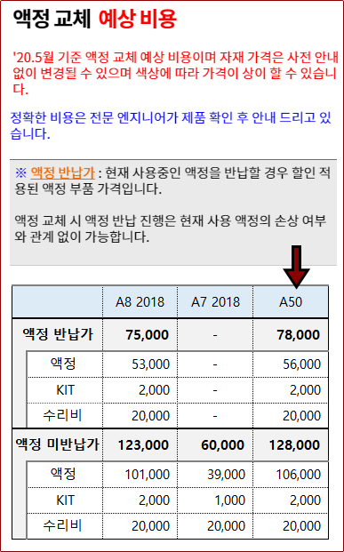 갤럭시A50 기기의 액정 수리비는